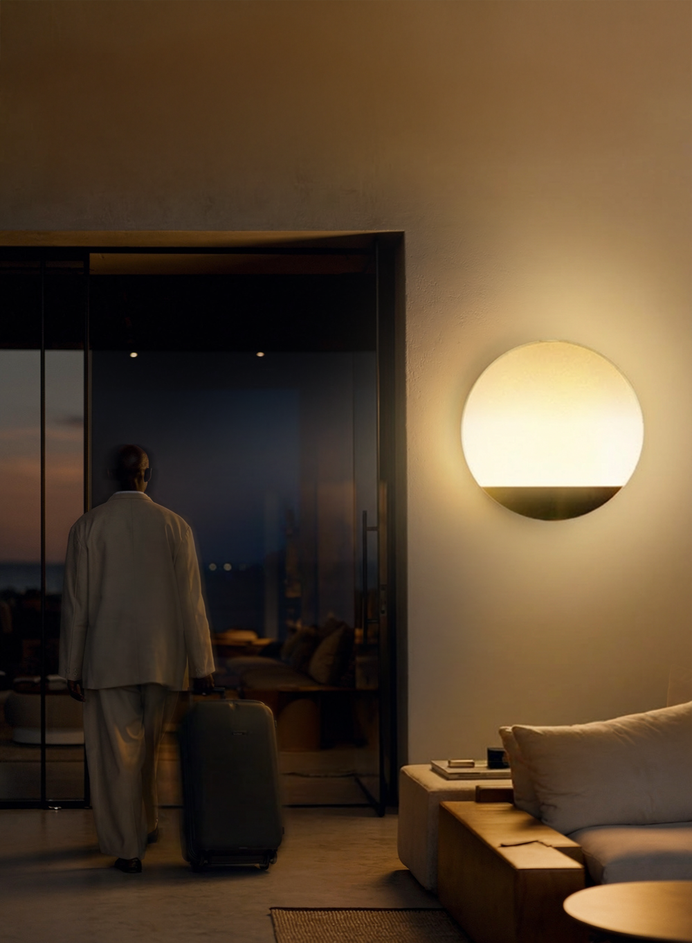 The collection creates a cozy experience through a dual luminous effect: a soft ambient glow that emerges from the front, paired with an indirect halo projected onto the wall. This peripheral light can be tuned to sunset tones through accessorized color filters.